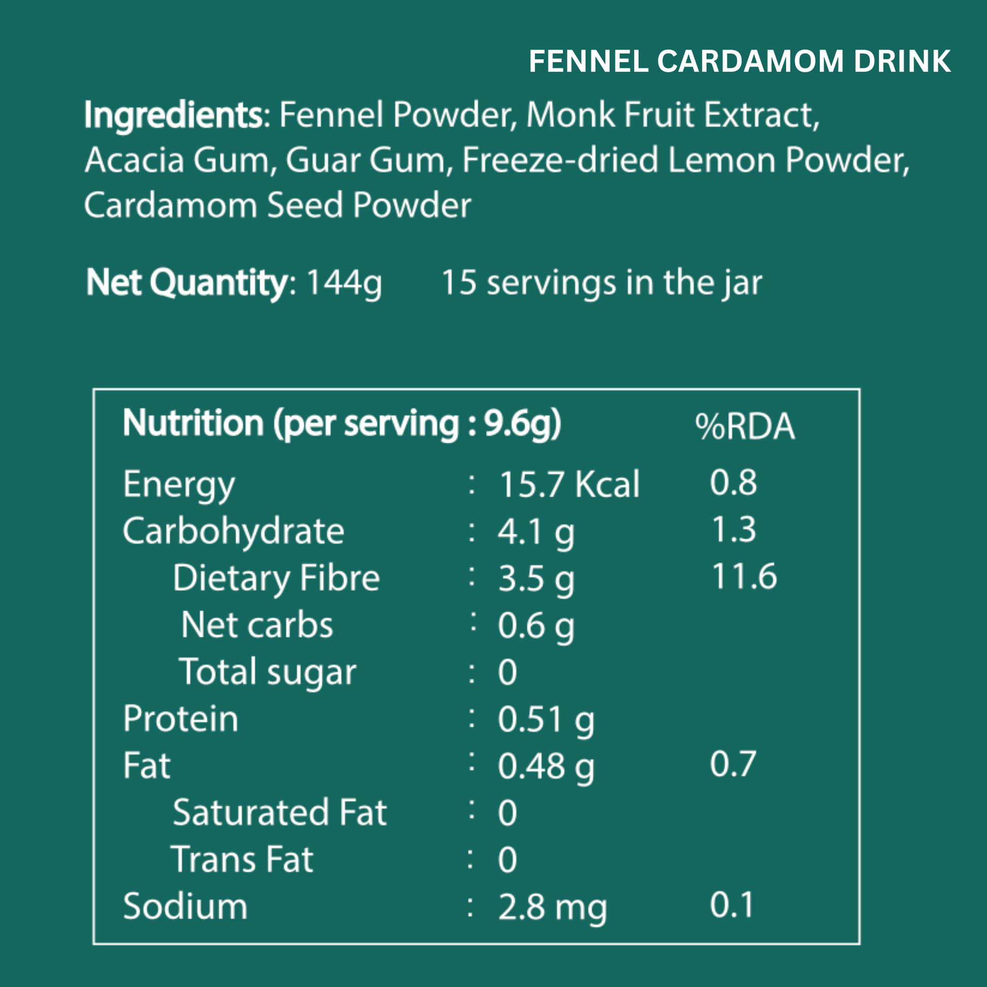Fennel Cardamom Drink: Mix 1.5 teaspoons (9.6g) with 250ml room temperature or cold water. Make it your post-meal ritual, daily gut health habit, or soothing evening sip.