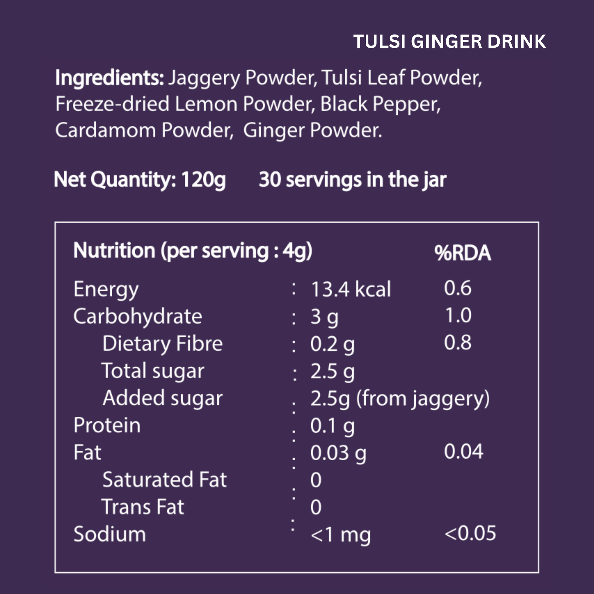 Tulsi Ginger: Mix ½ tablespoon (4 g) with 120 ml hot water. Best enjoyed warm as a soothing wellness sip.